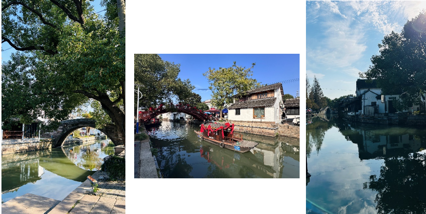 下午,我们从自然秘境切换至人文古镇。金泽古镇镇内河港纵横,宋元明清四朝古桥沿河依次排开,形成 “四朝古桥一线牵” 的独特景观。最令人称道的普济桥,用珍贵的武康石砌筑,雨天泛着淡淡紫光,作为上海最古老的石拱桥,桥顶 “咸淳三年” 的刻字见证着八百年风霜。与它南北对望的万安桥同为宋代遗存,弧形拱圈倒映水中,构成 “水天一碧” 的景致,被誉为 “最古老的姊妹桥”。行走在迎祥桥上,这座元代无栏无阶的梁式石桥,仿佛能想见当年骑兵策马而过的场景;而复刻《清明上河图》的普庆桥,以无钉无榫的捆绑工艺,展现着古代工匠的智慧。古镇商业化气息淡薄,原住民在闲谈,船工轻摇木橹,船儿在波光中平稳前行,时光仿佛在这里慢了下来。