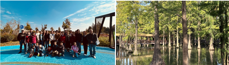 上午,我们抵达清西郊野公园,其核心魅力在于那片被誉为 “上海唯一水上森林” 的池杉秘境。我们选择秋日时节到访,本想观赏数千株池杉褪去翠绿,换上锈红盛装的胜景,但今年由于气温较高,杉树的颜色多数仍为绿色,略有美中不足。尽管如此,成千的杉树扎根于澄澈水中,阳光透过枝叶洒在水面上,波光粼粼,像是撒了一把碎金,宛如一幅流动的油画。沿着木栈道缓步前行,脚下栈道吱呀作响,耳边不时传来鸟鸣声,偶尔还能看到白鹭翩跹掠过,空气中弥漫着湿润的草木清香,让人瞬间忘却城市喧嚣。公园升级后的体验格外贴心,观光车解决了路程遥远的难题,我们乘观光车直达核心区后,漫步于乡野小径,沿途农田、鱼塘与芦苇荡交织,尽显田园野趣。