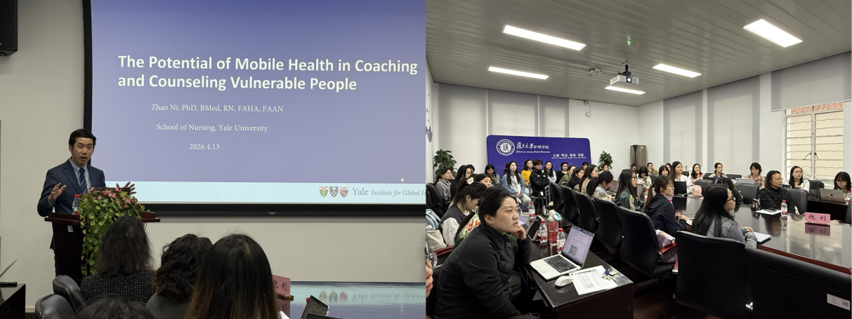 2026年4月13日下午,耶鲁大学护理学院助理教授倪钊应邀到访护理学院,以“移动医疗与全球健康”为主题,为师生带来了一场融合临床实践、技术创新与跨国研究的学术讲座,讲座由护理学院院长胡雁主持。